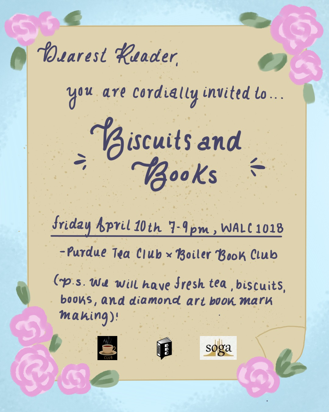 Join us at our upcoming Biscuits & Books event in collaboration with Purdue Tea Club! We’ll have fresh tea, biscuits, diamond paintings, games, and best of all FREE BOOKS. Event starts at 7:00pm at WALC 1018. Visit our announcements page for more information and we hope to see you there!
